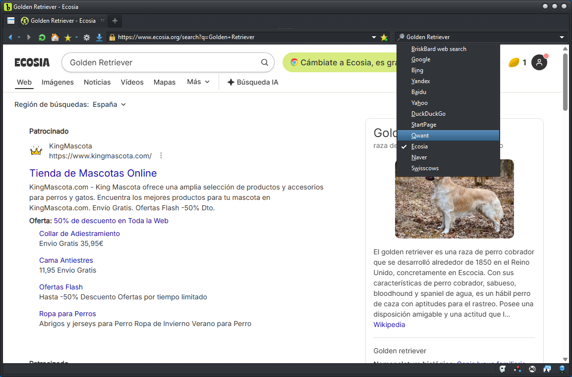 Si desea realizar búsquedas rápidas utilizando varios motores de búsqueda, solo tiene que escribir el término de búsqueda en el cuadro de búsqueda y seleccionar un motor de búsqueda diferente. BriskBard le llevará automáticamente a los resultados tan pronto como seleccione el nuevo motor de búsqueda.